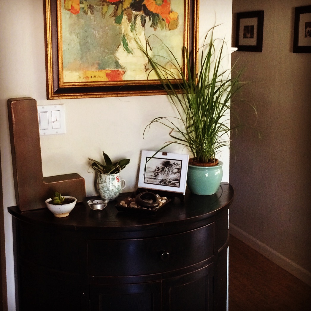 Natural elements in a home make me happy. Plants, sticks, stone…all calming components for me, an outdoorsy-tomboy. I love bringing them inside and incorporating them into my design. I have a father who is a biology professor who specialized in botany for his doctorate, so plants have always been a part of our vernacular. Growing up, Dad would casually point out what was growing around us and use its proper species name. To this day, I remember the specific names of my childhood house plants: dieffenbachia, rhododendron, philodendron…. They were not just plants—they had names. And plants not only beautify a space, but they contribute to your health of those living in the space. I love this Ted Talk about the importance of plants in our indoor spaces. Until a few months ago, I even had a fountain inside, as I found it was not getting used/enjoyed enough outside. A mini-garden with a babbling brook greeted you when you entered my home. (I also love creating inviting spaces outdoors. Stay tuned for an upcoming post about making the most of a postage-stamp garden.)
