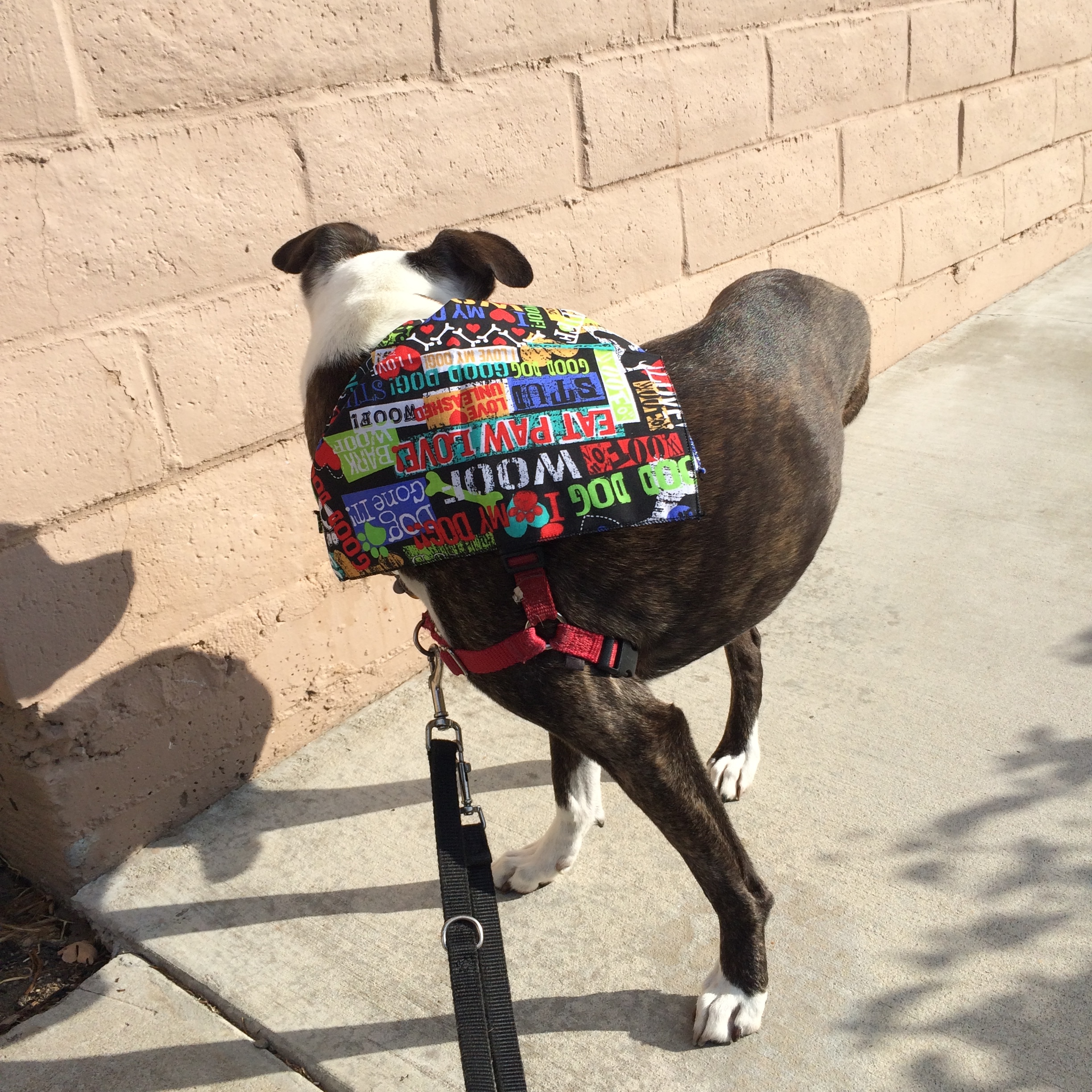 1st, Bristow had her second round of chemo today. Here she is on her way into Sage this morning, modeling her “chemo cape” that Auntie Caitlin and Uncle Cody and her besties Macey and Jax gave her. (Thanks again!) We appreciate any prayers and love you can spare sent her way, as she got pretty nauseous after her first round. She’s pre-loaded with meds this time, so hopefully she will be nausea-free. Her 1-month ampuversary was this past weekend, and she is still rocking and rolling with the tripawd lifestyle. A few minutes ago, I took her outside for her first frisbie fetch session post-amputation. Where she goes off-screen is where she wiped out. 3-legged sharp turns and acceleration are still being worked out, but she jumped back up and went for it. (Then she stared across the parking lot at Macey and Jax’s door for at least a minute, hoping they’d come out to play. Unfortunately, they moved in May, but she has not given up hope!)