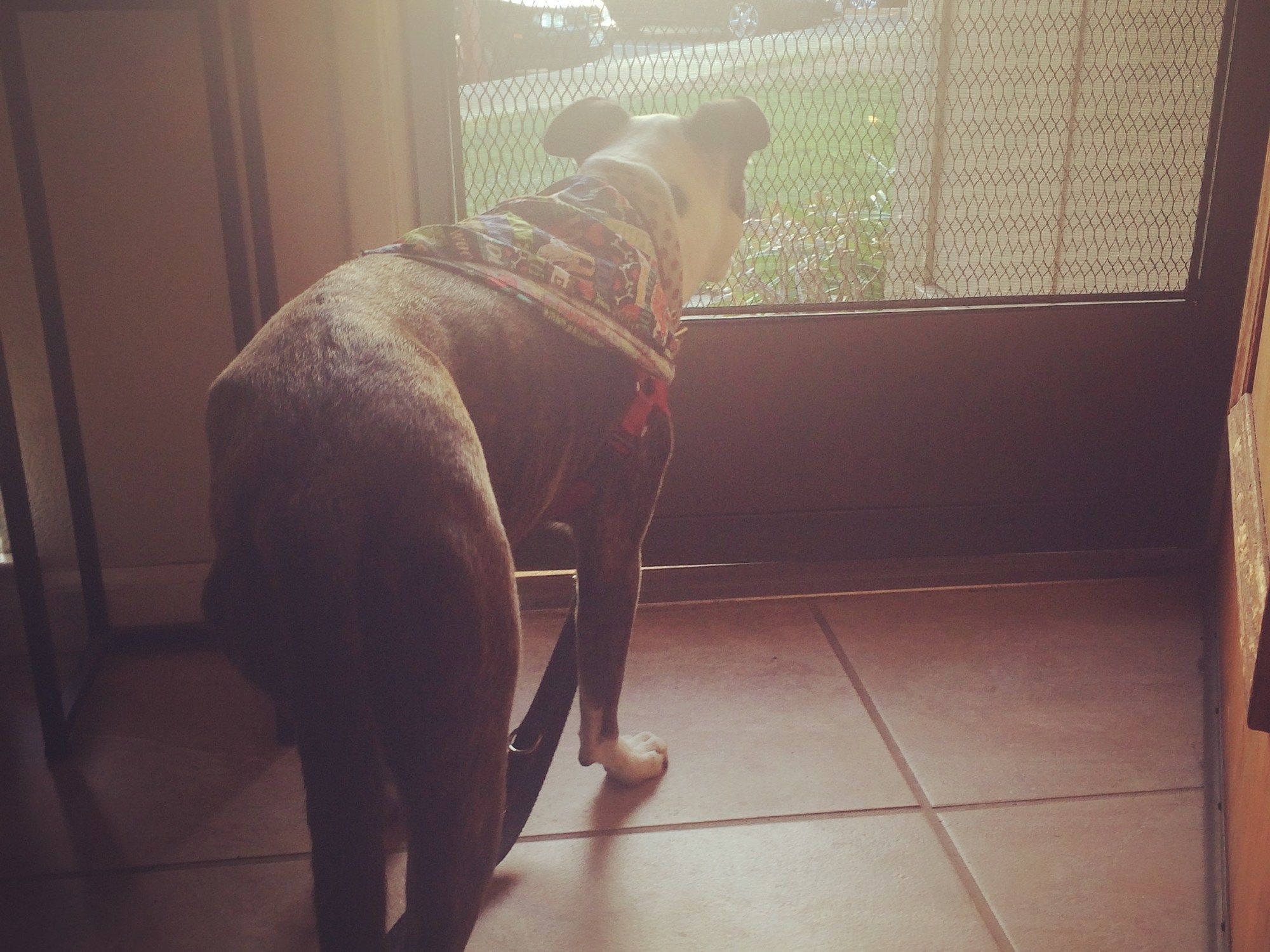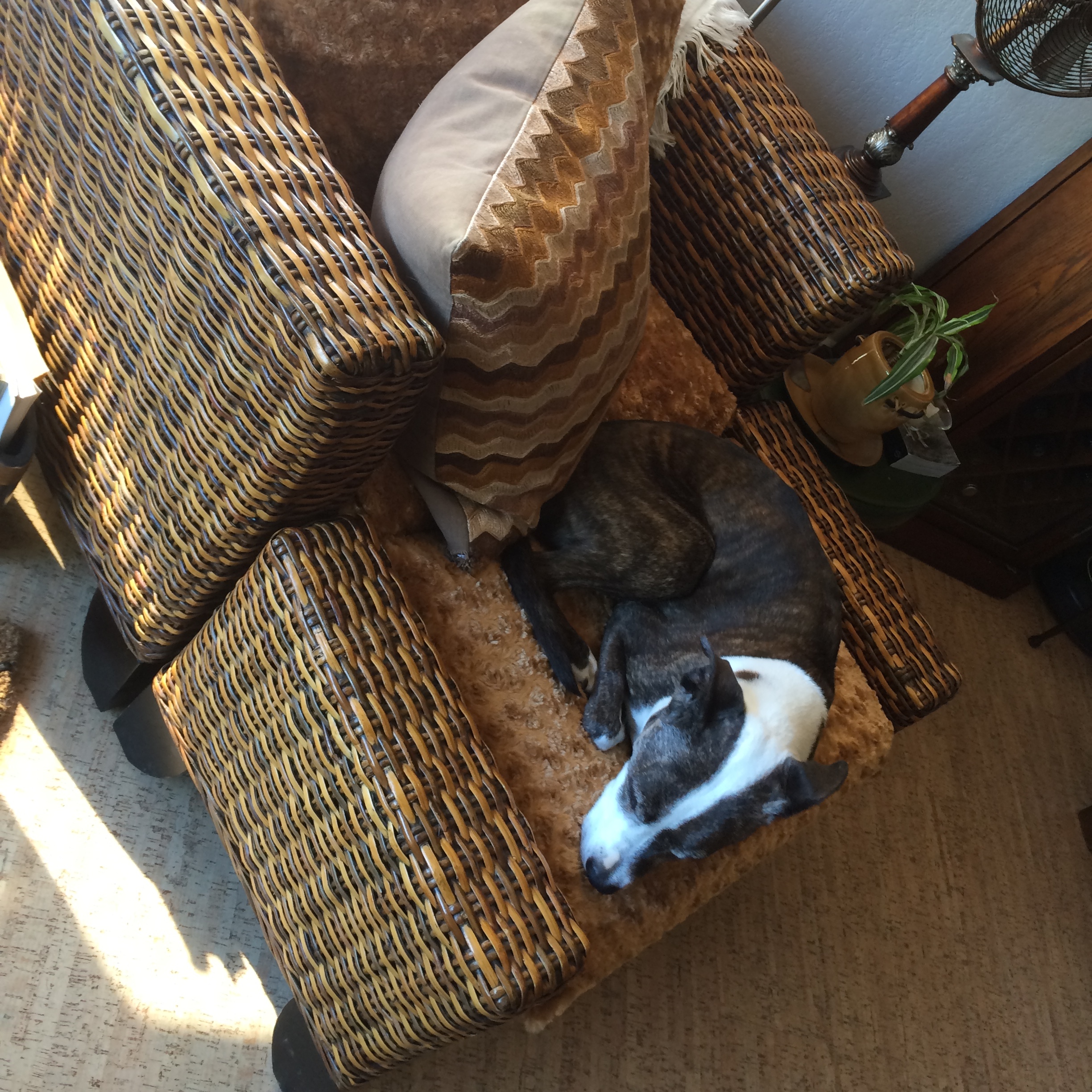 She inspires me continually. We have both been down a leg–her in a more extreme manner, of course–and we both deal with chronic pain. She does so more gracefully than most humans, including me. She has such a resilient spirit. After chemo last week, she took a grand tour of the entire office area to say hello to every employee, and then she greeted everyone who came in and out of the waiting room with a word and a wag. And she unknowingly encouraged a woman on her way out with her beautiful, brindle Great Dane. She had just learned her dog would be heading along the same path as Bristow: Hind leg amputation and subsequent chemo to fight osteosarcoma.